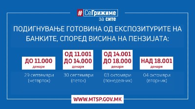 Министерството за труд и социјална политика известува дека на 29.9.2022 година (четврток) почнува етапната исплата на пензиите за септември, кои продолжуваат да се исплатуваат предвремено.